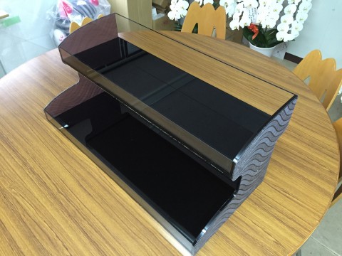 色のついたアクリル板を使い商品を陳列する2段タイプのケースを製作しました。 側面には装飾フィルムを貼り付け高級感を出しました。